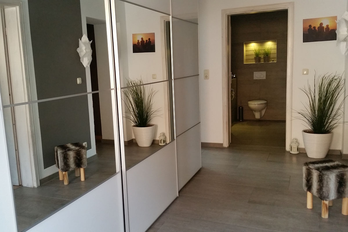 Bodenbelag, Betonoptik, Format 90/45 cm, Sockel mit Abschlussschiene, Fußmatte im Eingangsbereich